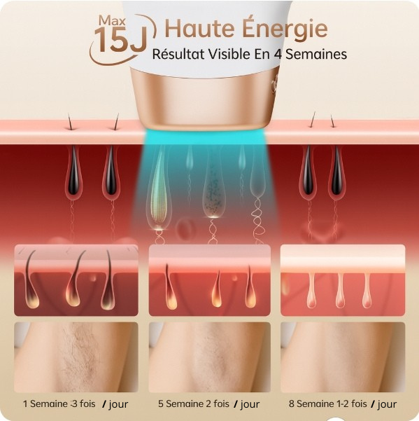 Il utilise des impulsions lumineuses pour cibler et réduire durablement la croissance des poils. En quelques semaines, vous verrez une diminution visible des poils.